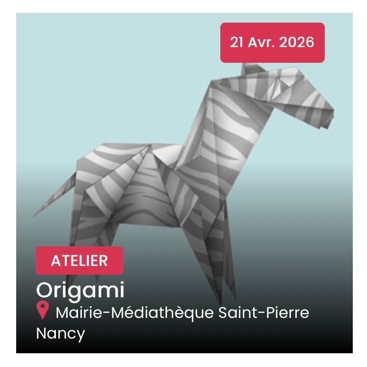 Ateliers créatifs (Atelier origamis) à la Marie-Médiathèque Saint-Pierre à Nancy aura lieu le 21 avril. L'inscription sur le site.